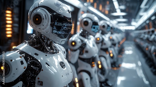 Fototapeta premium A futuristic robot army stands in formation within an industrial setting,...