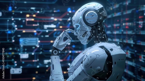 Fototapeta premium A futuristic robot deep in thought, surrounded by a digital landscape filled with intricate circuitry and glowing data nodes.