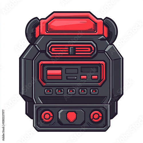 Fototapeta premium A futuristic robot head with a black and red design, featuring buttons, dials, and a screen.