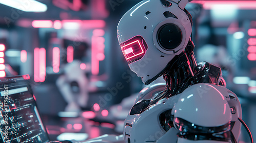 © MimiPERI, Fototapeta premium A futuristic robot interacts with a computer in a neon-lit environment.