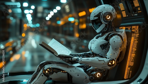 © Thanyana, Fototapeta premium A futuristic robot reading a book inside a sleek selfdriving vehicle