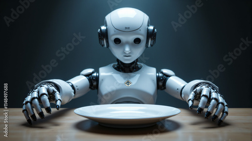 © PRODPLEUM DESIGN, Naklejka premium A futuristic robot sits at a table, gazing at an empty plate, ready to serve.