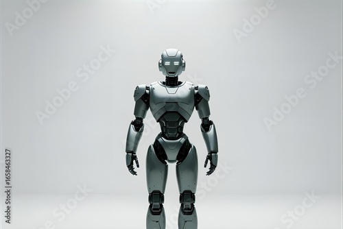 © Aimi, Fototapeta premium A futuristic robot standing alone, minimalistic design, white empty background, high detail, front view.