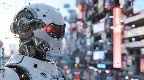Fototapeta premium A futuristic robot stands in a city with glowing lights.