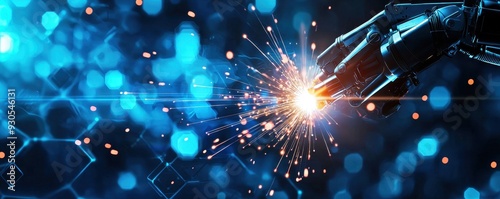 © Rossarin, Obraz premium A futuristic robotic hand igniting a spark in a digital landscape, symbolizing innovation and technology advancement.