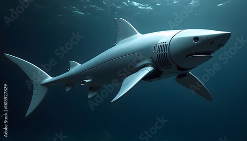 Fototapeta premium A futuristic robotic shark swims gracefully through the deep ocean, a blend of technology and marine life.