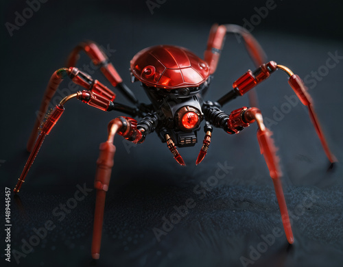 Fototapeta premium A futuristic robotic spider, with a blend of black and metallic red, stands on a dark surface.