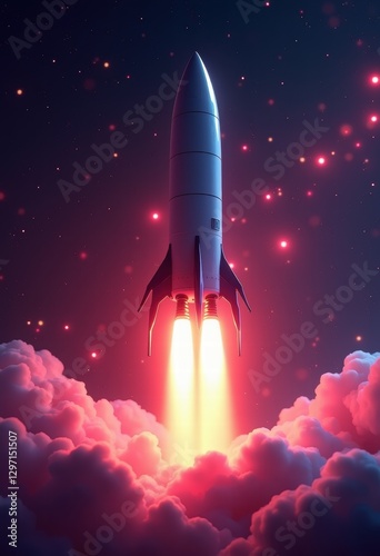 Fototapeta premium A futuristic rocket launching into space, surrounded by vibrant clouds and twinkling stars, symbolizing exploration and innovation.