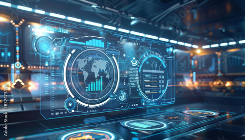 Obraz premium A futuristic room with a large screen showing a globe and a few other screens...