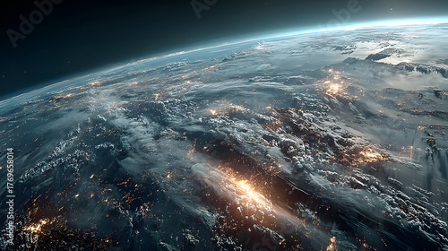 Fototapeta premium A futuristic satellite collecting climate data from Earth with glowing interface overlays.