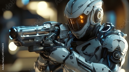 © Mr image, Fototapeta premium 4. **A futuristic sci-fi soldier in high-tech exosuit, holding an energy weapon