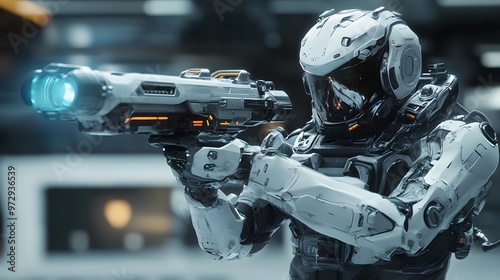 © Mr image, Fototapeta premium 4. **A futuristic sci-fi soldier in high-tech exosuit, holding an energy weapon