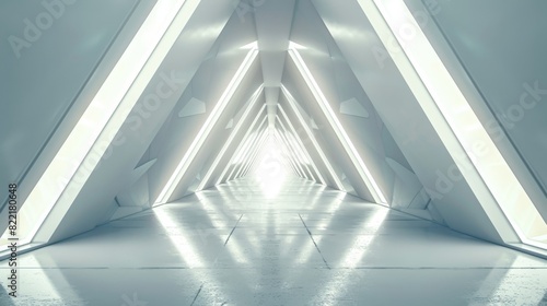 © Bundi, Fototapeta premium A futuristic sci-fi triangle tunnel in the middle of an empty long light corridor surrounded by a white modern background.