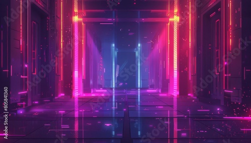 Obraz premium A futuristic scifi hallway in pixel art style, where neon lights and doors...