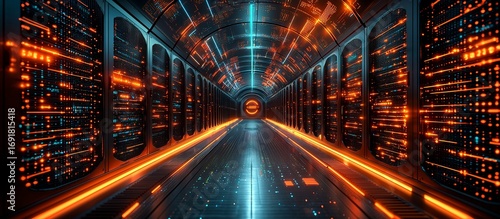 © pakndit, Fototapeta premium A futuristic server room hallway with glowing data displays prominently featured