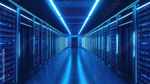 Fototapeta premium A futuristic server room with blue-lit racks and a sleek modern design,...