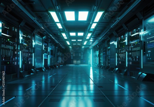 © TommyNa, Fototapeta premium A futuristic server room with glowing blue lights illuminating rows of advanced server racks and sleek metallic floors. Ideal for technology, IT infrastructure, and data center visuals