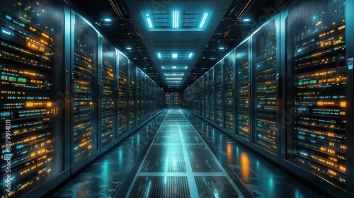Fototapeta premium A futuristic server room with illuminated data storage units.