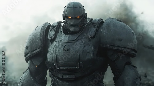 © aan, Fototapeta premium A futuristic soldier in heavy, tech-heavy armor, glowing eyes piercing through the smoke, standing resolutely on the battlefield.