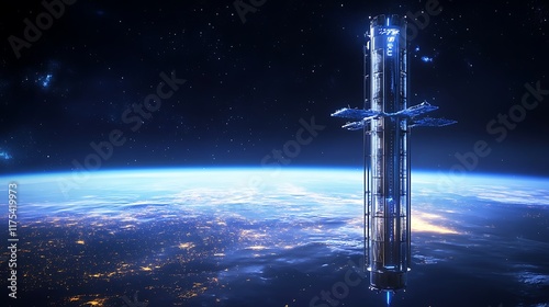 Naklejka premium A futuristic space elevator stretching from a glowing earth to the stars, with advanced spacecraft docked around the structure