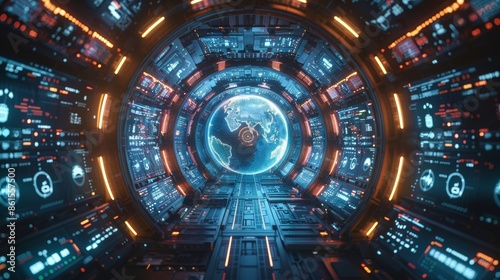 Obraz premium A Futuristic Spacecraft Corridor With A View of Earth. Generative AI