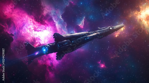 Obraz premium A futuristic spaceship travels through a vibrant nebula, its engine glowing...