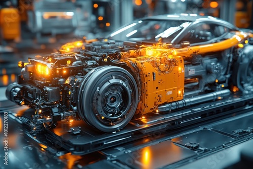 © zulie, Fototapeta premium A futuristic sports car on a production line with glowing wires and circuitry, highlighting the advanced technology and design.