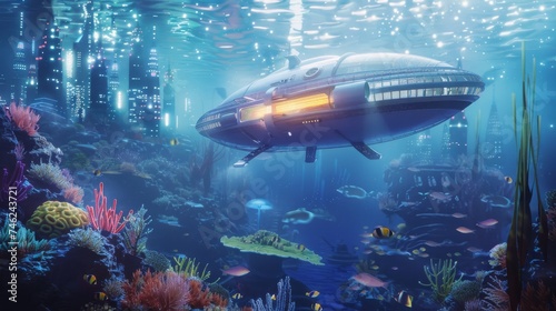 Fototapeta premium A futuristic submarine explores a submerged city among vivid coral reefs and...