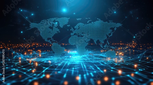 Fototapeta premium A futuristic support center concept with a digital world map and glowing network connection points.