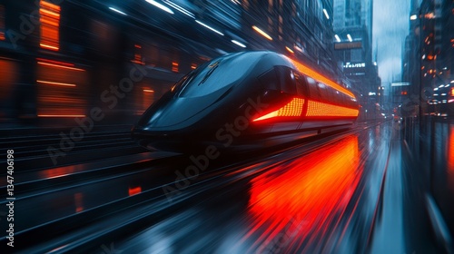 Fototapeta premium A futuristic train speeds through a rainy urban landscape, illuminated by...