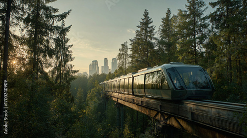 Naklejka premium A futuristic train traveling through a lush forest with a city skyline in the...