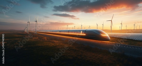 Fototapeta premium A futuristic train travels through a landscape with wind turbines at sunset.