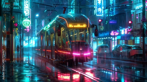 Fototapeta premium A futuristic tram illuminated in neon lights, gliding smoothly through a rain-soaked urban landscape at dusk, evoking a cyberpunk atmosphere