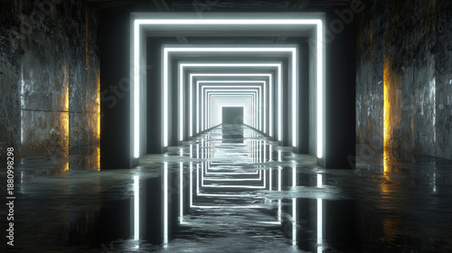 © Jhati, Fototapeta premium A futuristic tunnel with glowing white lights and reflective wet floor surfaces