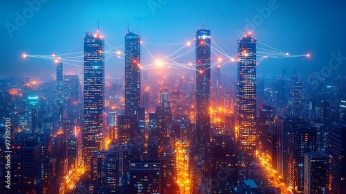 © TranNgoc, Fototapeta premium A futuristic urban landscape at night, with illuminated lines of wireless connectivity linking towering high-rises. The neon-lit communication lines create a seamless network across the cityscape,