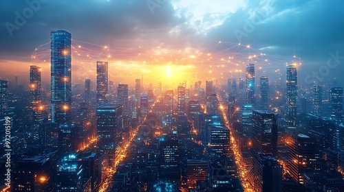 Fototapeta premium A futuristic urban landscape glowing with interconnected data lines that...
