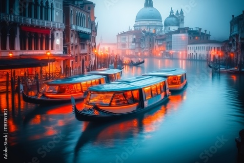 © Thanyarat, Fototapeta premium A futuristic Venice with floating glass gondolas navigating glowing neon canals, surrounded by sleek, high-tech buildings blending with the city's classic architecture