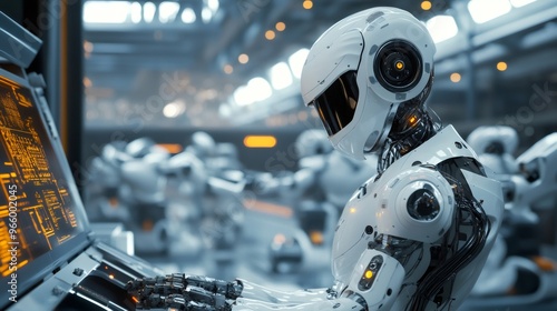 © Wish Craft Arts, Fototapeta premium A futuristic white robot with a helmet is working at a computer terminal.