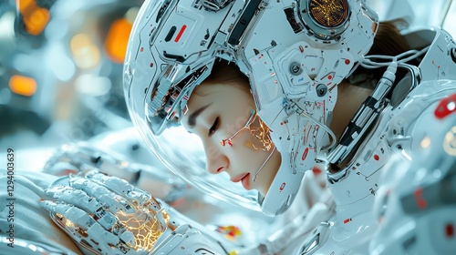 © DekYas, Fototapeta premium A futuristic woman wearing a space helmet and resting