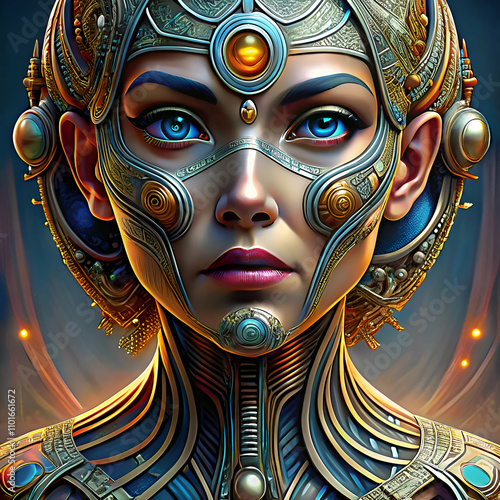 Naklejka premium A futuristic woman with ornate golden and blue armor stares directly at the...