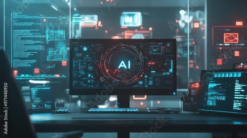 Obraz premium A futuristic workspace with a digital screen showing "AI" in the center and...