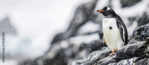 Fototapeta premium A Galapagos Penguin standing on a rock Spheniscus mendiculus. Copy space image. Place for adding text