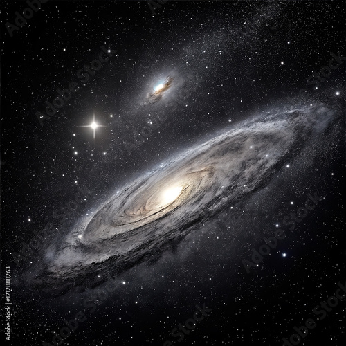 © Iaroslav, Fototapeta premium A galaxy with a bright glowing center and spiral arms set against a starry background.