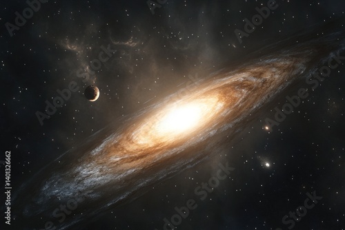 Fototapeta premium A galaxy with a bright star at its center, surrounded by swirling clouds of gas and distant planets. The vastness of space evokes a sense of wonder and exploration.