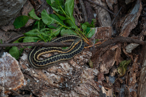 © Matt, Fototapeta premium A Garden Snake coiled up on a rock during summer
