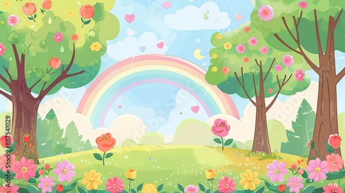 © imlane, Fototapeta premium A garden with Apple trees, chrysanthemums, roses are the most prominent, the sky is blue like after rain and there is a rainbow, cartoon vector illustration with white background for graphic design an
