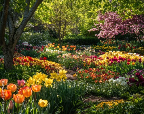 © Carlos, Fototapeta premium A garden with many different colored flowers, including yellow, orange, and pink