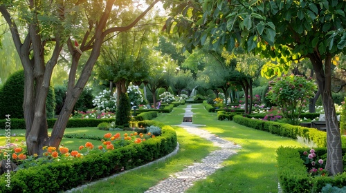 © Yelena, Obraz premium A garden with trimmed apricot trees img
