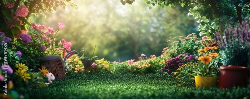 © Coosh448, Obraz premium A gardening tools ad with a lush green backdrop and vibrant flowers, 4K photo.