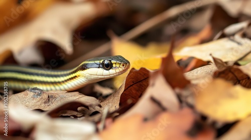 Fototapeta premium A garter snake emerging from a pile of leaves, its small, slender body and...